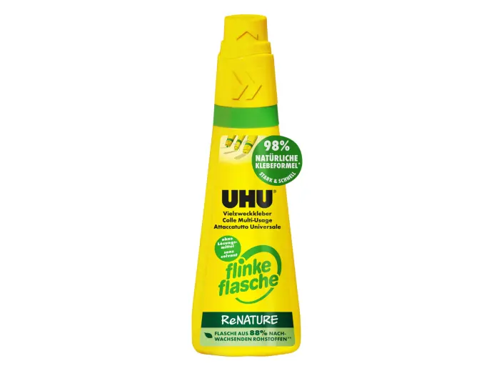 UHU flinke flasche ReNATURE ist der weltweit erste Klebstoff in einer Flasche aus pflanzenbasierten Rohstoffen. Sie besteht zu 88 % aus Bio-Kunststoff, der aus Zuckerrohr gewonnen wird. Die Klebstoff-Formel besteht zu 98 % aus natürlichen Inhaltsstoffen (inklusive Wasser).