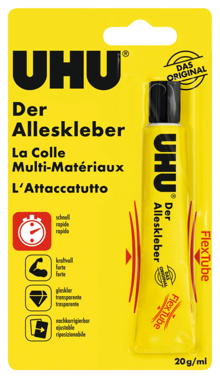 Universell - klebt Holz, auf Holz basierende Materialien, Kunststoffe (ABS-Kunststoff, hartes und weiches PVC, Plexiglas®, Polystyrol, Resopal®), Metall, Glas, Porzellan, Keramik, Leder, Gummi, Filz, Kork, Textil, Karton, Papier, sogar Styropor® und vieles mehr.