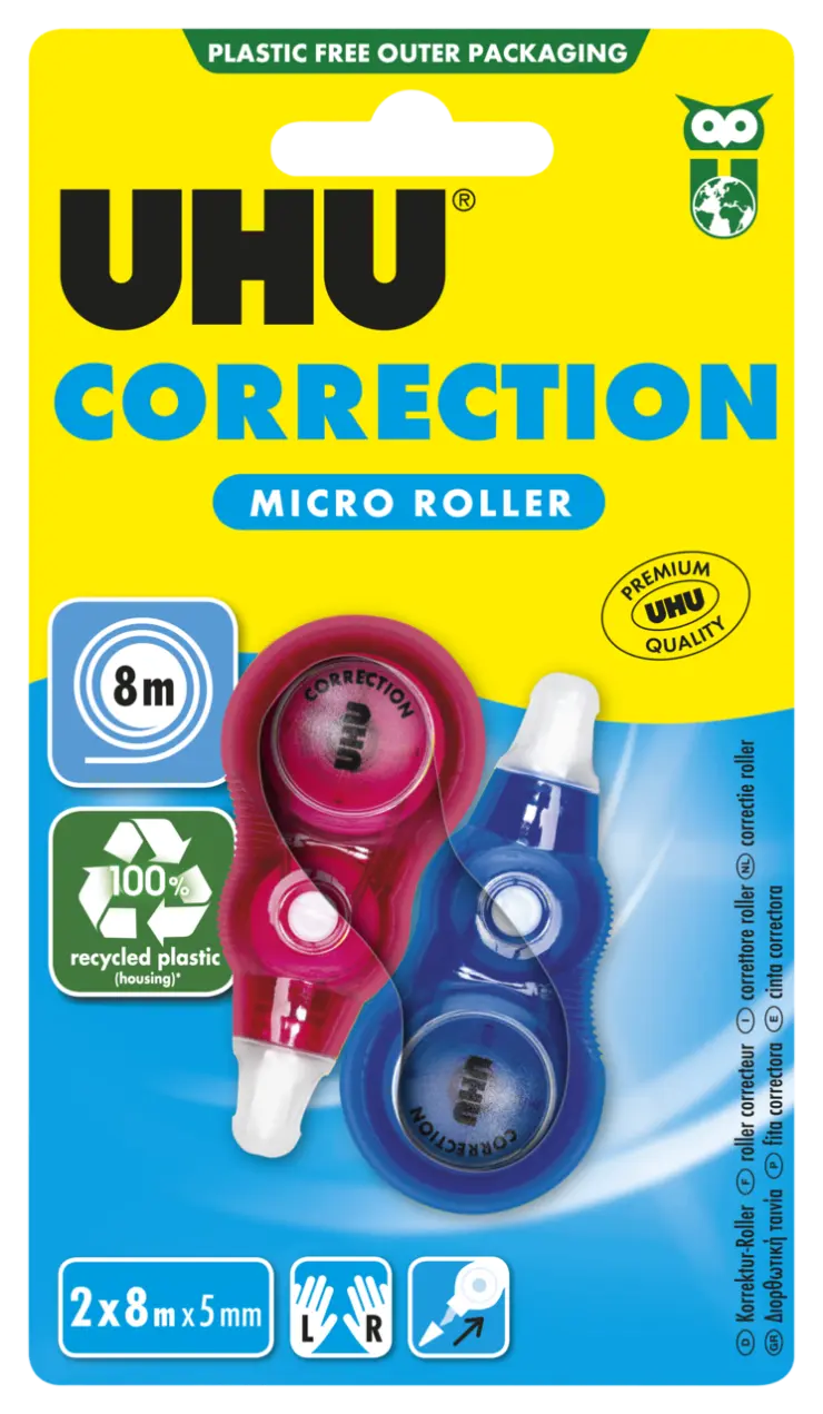 Correction Micro Roller mit maximaler Bandlänge. Farbige Micro Korrektur-Roller für schnelles, sauberes und zeilengenaues Korrigieren von Handgeschriebenem und Gedrucktem. Für nahezu alle Papiertypen geeignet. Sofort überschreibbar, keine Trockenzeit und lösungsmittelfrei. Ideal für das Federmäppchen. Verfügbar in vier verschiedenen bunten Farben. Die Bandlänge beträgt 8,0 m und die Bandbreite 5,0 mm. Die Verpackung besteht zu mehr als 98 % aus recyceltem Karton.