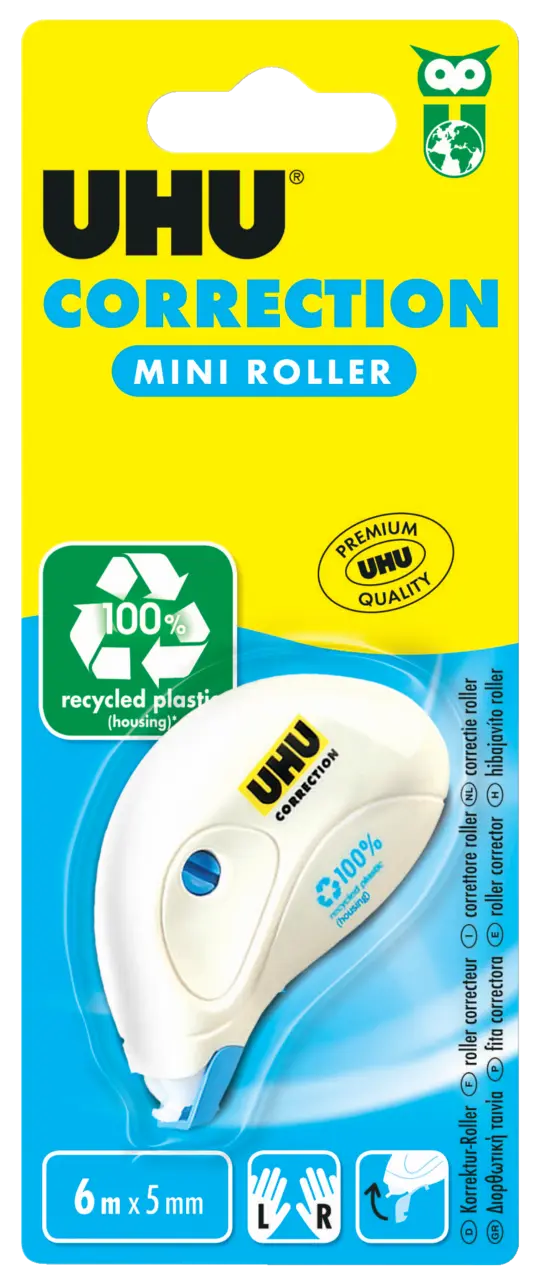 Correction Roller Mini. Praktischer Mini Korrektur Roller für sauberes und zeilengenaues Korrigieren von Handgeschriebenem und Gedrucktem. Für fast alle Papiertypen geeignet. Sofort überschreibbar, keine Trocknungszeit und lösungsmittelfrei. Mit integrierter Kappe, die zum Schutz und als Standhilfe dient. Verfügt über eine Öffnung zur Kontrolle der Restbandlänge und Bandstraffer. Ideal fürs Federmäppchen. Die Bandlänge beträgt 6,0 m und die Bandbreite 5,0 mm. Der Roller (Gehäuse) besteht aus 100 % recyceltem Kunststoff und die Verpackung wurde zu >85 % aus recyceltem Karton hergestellt.
