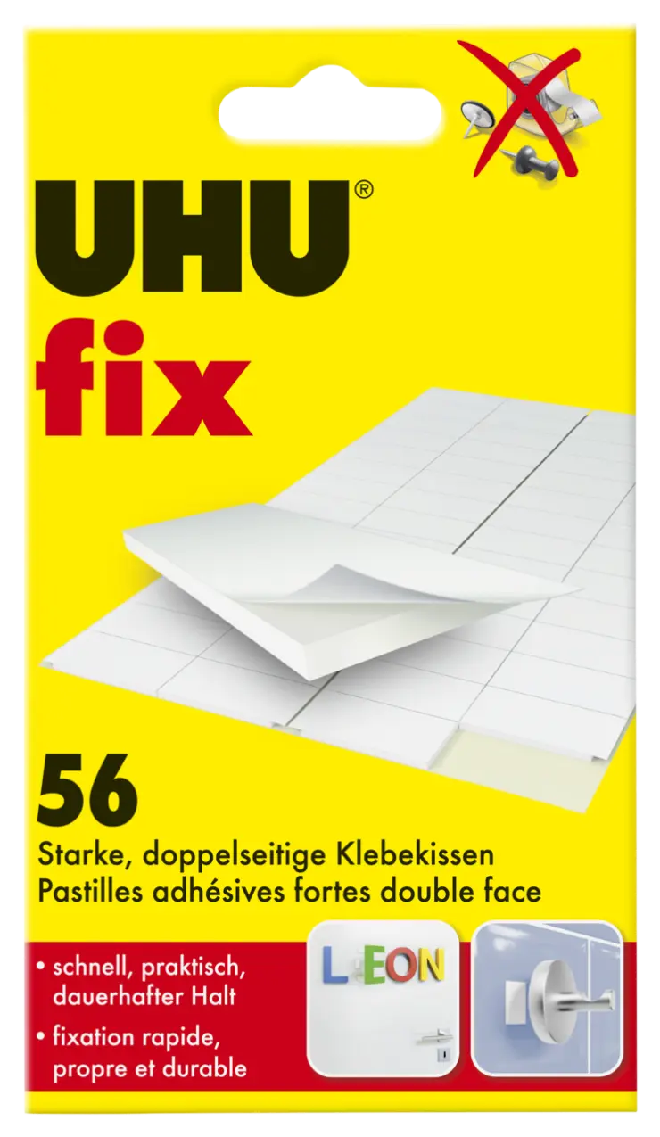 Entfernen Sie ein Klebekissen vorsichtig von der Folie, ohne die Seite mit dem Klebstoff anzufassen. Tragen Sie das Klebekissen auf dem zu befestigenden Objekt auf. Entfernen Sie die Schutzfolie. Fixieren Sie das Objekt durch festes Andrücken auf dem gewünschten Untergrund.