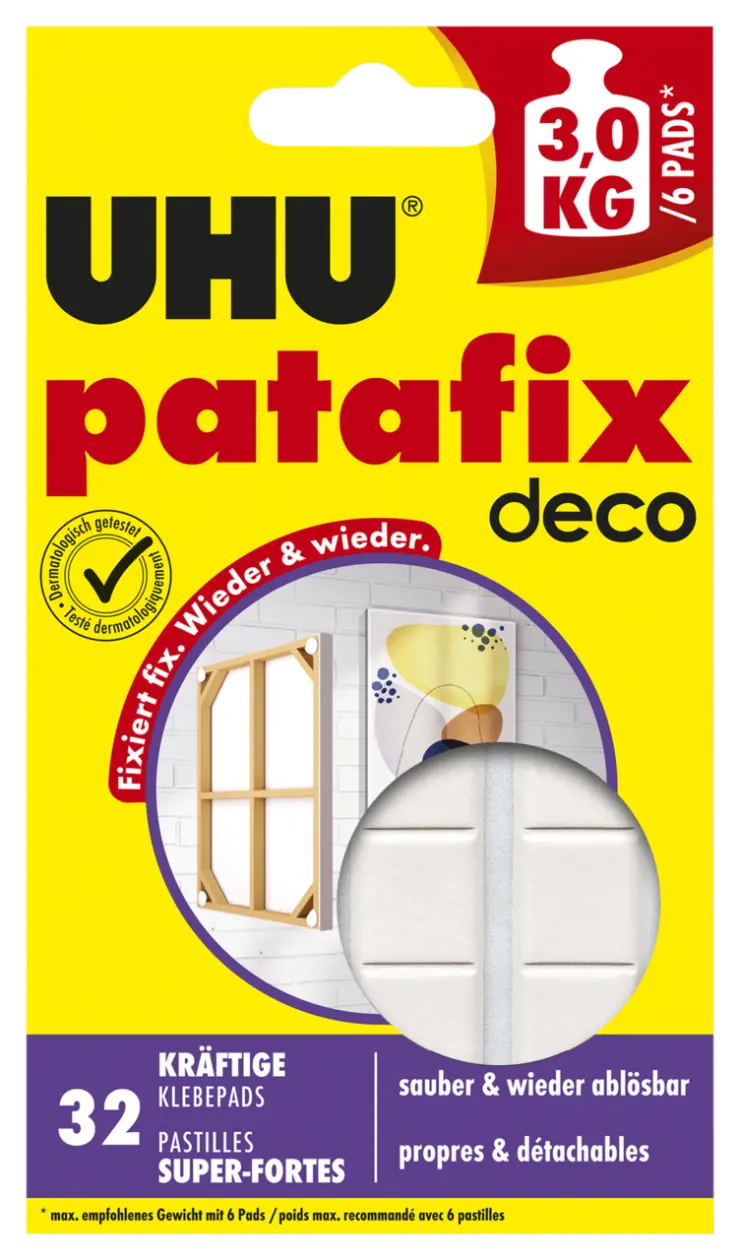 Mögliche Rückstände können durch Abtupfen mit einem anderen Klebepad entfernt werden. UHU patafix Deco kann eventuell einen fettigen Fleck auf saugfähigen Oberflächen hinterlassen, dieser kann normalerweise mit Waschbenzin entfernt werden.
