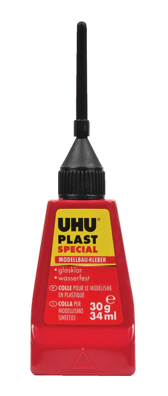 UHU plast spezial klebt sehr gut auf verschiedenen Kunststoffen, wie Polystyren und schlagfesten Polystyrol Arten (ABS, SAN, SB, ASA), Polyvinylchlorid (PVC) hart und weich, plexiglas® (PMMA), Zelluloid®, Celluloseester (CN, CAB), Polycarbonat (PC). UHU plast spezial klebt auch andere Materialien, wie Holz, Papier und Karton (in Verbindung mit den oben genannten Kunststoffen).