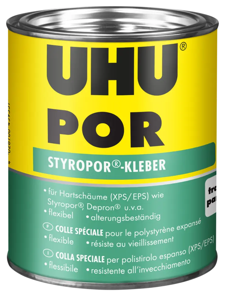 - Schnell anziehender Spezialklebstoff zum Kleben von Polystyrol-Hartschaum (z. B. Styropor®), auch in Kombination mit anderen Materialien