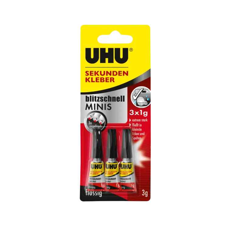 Sekundenkleber enthält Cyanacrylat. Verklebt Haut und Augenlider in Sekunden. Bei Kontakt mit den Augen vorsichtig für einige Minuten mit viel Wasser ausspülen and medizinischen Rat einholen. Bei Hautkontakt kann der Kleber mit Hilfe von warmem, seifigen Wasser abgewaschen werden. Danach die Haut eincremen. Kann Atembeschwerden verursachen. Vermeiden Sie es, die Dämpfe einzuatmen. Außerhalb der Reichweite von Kindern aufbewahren.
