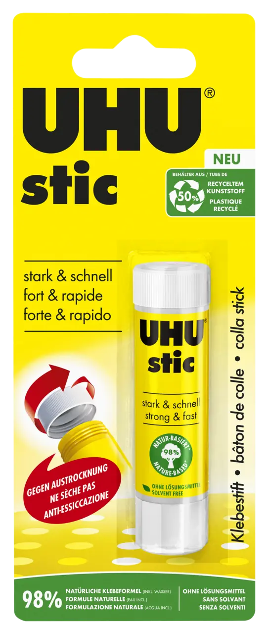 UHU stic wird mit leichtem Druck auf den zu klebenden Materialien aufgetragen. Die Teile werden direkt nach dem Auftragen des Klebstoffes zusammengedrückt.