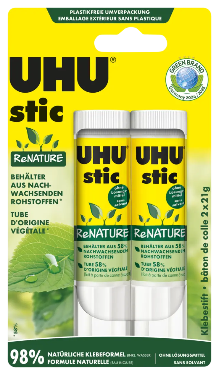- Klebeformel aus 98 % naturbasierten Inhaltsstoffen (inkl. Wasser)