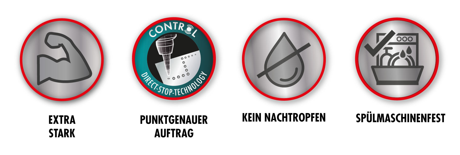 Direct-Stop-Technologie: Dosiert punktgenau und tropft nicht nach, selbst für kleinste Ecken und Spalten