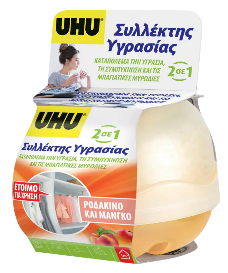 Μειώνει με χρήση ενεργών υγροσκοπικών κρυστάλλων την υπερβολική σχετική υγρασία σε μικρούς (κλειστούς) χώρους με ελάχιστο ή καθόλου εξαερισμό. Απελευθερώνει ταυτόχρονα μία υπέροχη μυρωδιά.