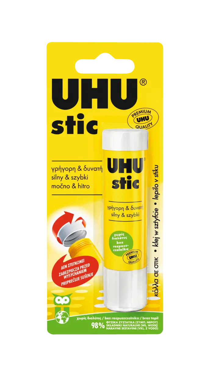 Η UHU stic εφαρμόζεται με ελαφριά πίεση στα υλικά που πρόκειται να κολληθούν. Τα μέρη τοποθετούνται αμέσως μετά την εφαρμογή της κόλλας.