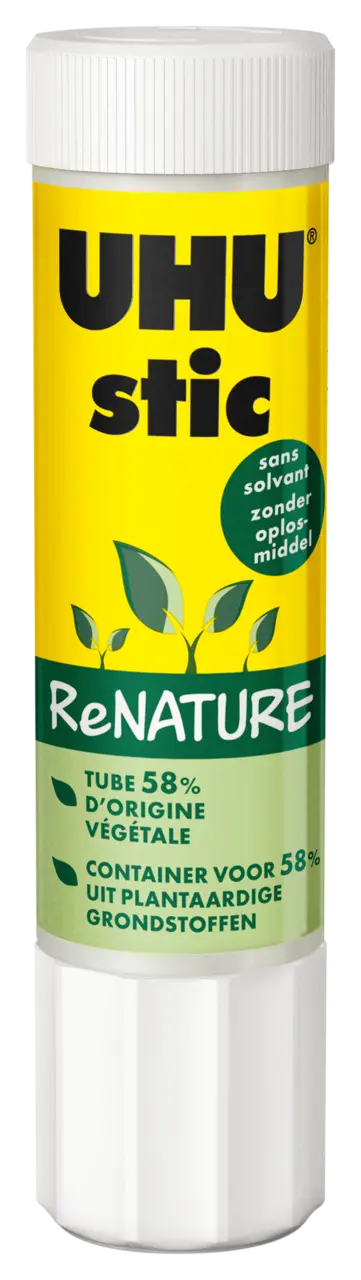 Η κόλλα σε στικ που "Κατασκευάζεται στη Γερμανία" με δοχείο που αποτελείται από 58% ακατέργαστα φυτικά υλικά. Μειώνει τις εκπομπές CO2* και περιορίζει την κατανάλωση πρώτων ορυκτών υλών*. Με μοναδικό βιδωτό πώμα που αποτρέπει την κόλλα να στεγνώσει. Η σύσταση της κόλλας αποτελείται από 98% φυσικά συστατικά (περιλαμβανομένου του νερού) και δεν περιέχει διαλύτες. Κολλάει ισχυρά, γρήγορα και ανθεκτικά, γλιστράει ομαλά, είναι άκρως αποτελεσματικό και πλένεται εύκολα με κρύο νερό. *σε σύγκριση με το τυπικό στικ GLUE STICKS RENATURE, UHU stic Pasta white Relaunch, NORDIC SWAN ECOLABEL, GREEN BRAND, σημείωσε μέσο όρο ανώτερο από το συνολικό κύκλο διάρκειας ζωής (υπολογισμένο από το denkstatt / Βιέννη, Απρίλιος 2013)