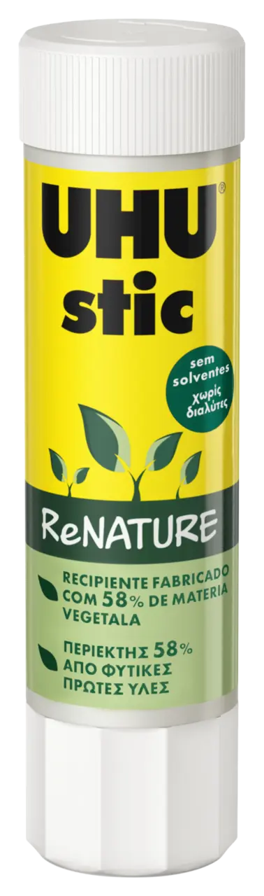 Η κόλλα σε στικ που "Κατασκευάζεται στη Γερμανία" με δοχείο που αποτελείται από 58% ακατέργαστα φυτικά υλικά. Μειώνει τις εκπομπές CO2* και περιορίζει την κατανάλωση πρώτων ορυκτών υλών*. Με μοναδικό βιδωτό πώμα που αποτρέπει την κόλλα να στεγνώσει. Η σύσταση της κόλλας αποτελείται από 98% φυσικά συστατικά (περιλαμβανομένου του νερού) και δεν περιέχει διαλύτες. Κολλάει ισχυρά, γρήγορα και ανθεκτικά, γλιστράει ομαλά, είναι άκρως αποτελεσματικό και πλένεται εύκολα με κρύο νερό. *σε σύγκριση με το τυπικό στικ GLUE STICKS RENATURE, UHU stic Pasta white Relaunch, NORDIC SWAN ECOLABEL, GREEN BRAND, σημείωσε μέσο όρο ανώτερο από το συνολικό κύκλο διάρκειας ζωής (υπολογισμένο από το denkstatt / Βιέννη, Απρίλιος 2013)