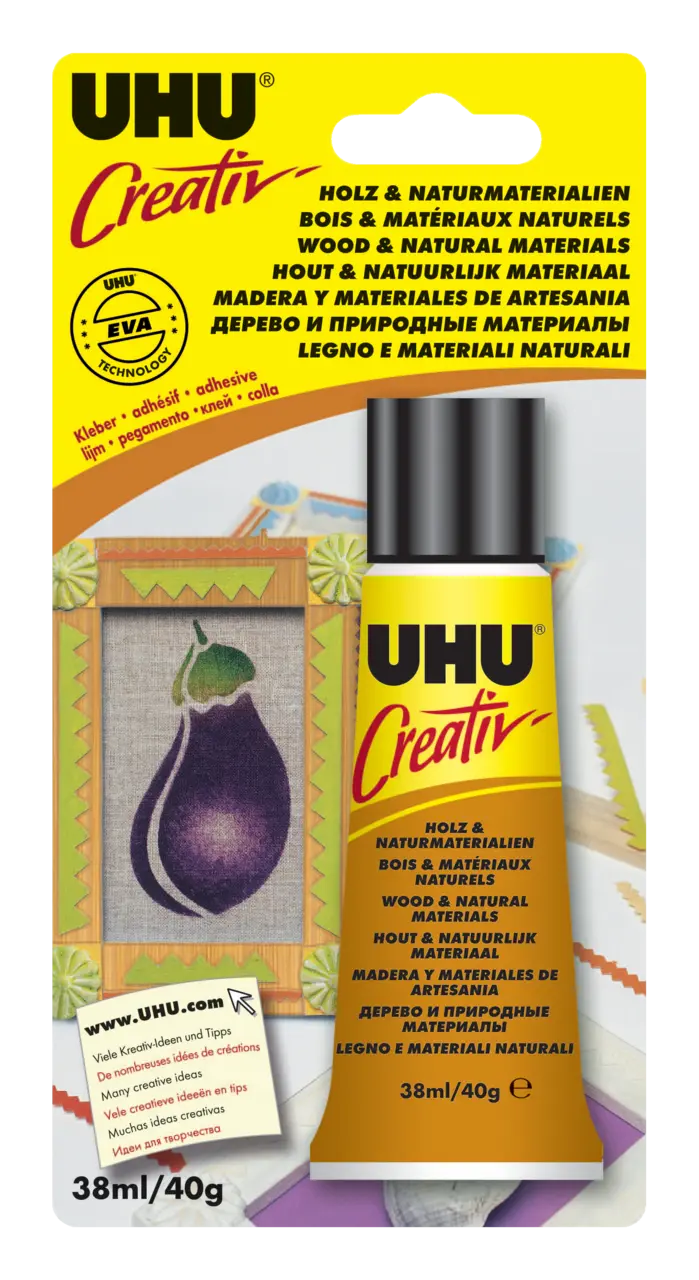 Glues wood, balsa, cork, wood based materials, natural materials like straw, bast, flax, hair, dried flowers, leaves, feathers, also in combination with many other materials, as long as one of the parts to be stuck together will absorb water or is porous.