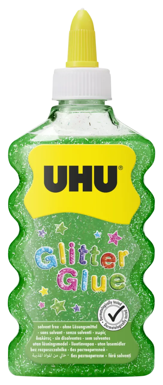UHU Glitter Glue – Coloured adhesive with glitter particles for handicraft and creative decorating of lots of materials. Bright colours and brilliant glitter effects. The soft bottle with a precision applicator enables clean and precise working. Non-drip and no stringing. UHU Glitter Glue is solvent-free and water washable as well as dermatologically tested. Available in 6 bright colours.