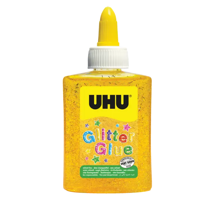 UHU Glitter Glue – Coloured adhesive with glitter particles for handicraft and creative decorating of lots of materials. Bright colours and brilliant glitter effects. The soft bottle with a precision applicator enables clean and precise working. Non-drip and no stringing. UHU Glitter Glue is solvent-free and water washable as well as dermatologically tested. Available in 6 bright colours.