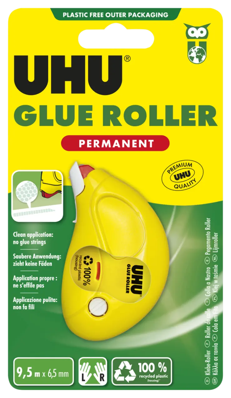 The convenient glue roller for permanent gluing of paper, cardboard and photos to similar materials and many smooth surfaces. The innovative glue tape with SMART DOT Technology enables a fast, clean and precise application without pulling glue strings.Glues immediately, needs no drying time and is solvent free. With an integrated cap for tape protection and self-standing support, remaining tape length display and a tape tightening screw.The tape length is 9.5 m, the tape width is 6.5 mm. The roller (housing) consists of 100 % recycled plastic and the packaging is made of more than 85 % recycled cardboard.