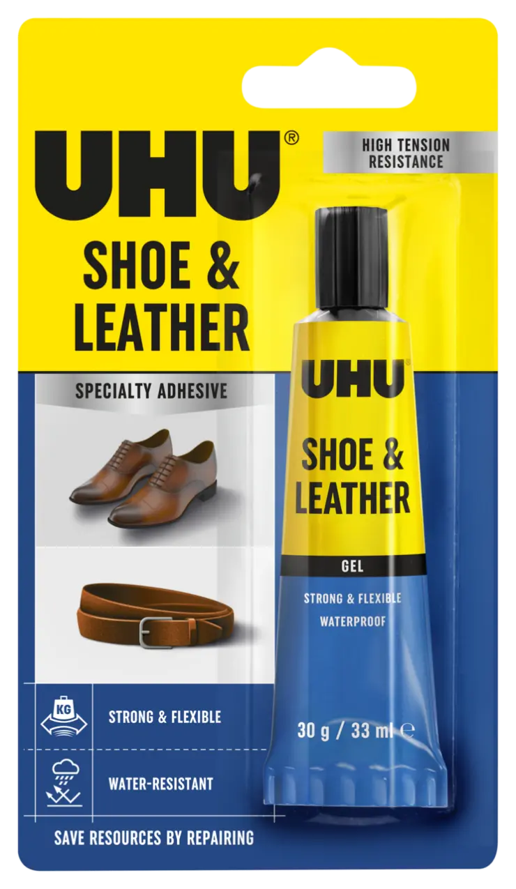Method of application: a) The contact method: Apply shoe & leather evenly to both of the parts to be stuck together using a toothed spatula or a short-bristled brush. Apply a number of times to very absorbent materials (leather, fabric, felt, etc) until a readily visible film of adhesive remains. Keep the parts separate until the layer of adhesive is dry to the touch (this takes 10-15 minutes, depending on the temperature). Then place the parts together in their exact position and press together very firmly for a short time. No adjustment can be made. The firmness of the assembly depends on the amount of pressure applied and not the amount of time the pressure is applied – a few seconds is sufficient. If the assembly has been put together properly, it may be worked on immediately. b) The heat reactivation method: This method is recommended when both of the parts to be stuck together require a very high degree of initial bonding. Using this method also makes the assembly more resistant to heat. Apply adhesive to both parts of the assembly, as for the contact method (see above). Leave until completely dry. At any time subsequently, the parts are placed together in their exact position and bonded by applying heat in the region of +120°C to +150°C (using a heat press, infra-red lamp or a hot air blower; for small parts a household iron may be used). When using this method, care must be taken that the requested temperature must advance up to the adhesive joints. When this method is used, no adjustment is possible. If the parts of the join are under tension (curves, overlays, etc.), the assembly should be maintained in place until it has cooled down to room temperature. c) The solvent reactivation method: This method is recommended if it is preferred to extend the working time beyond about 30 minutes, for example to prepare the parts, or to temporarily store them and take up the assembly again at a later period in time. The adhesive is applied to both sides of the assembly, as for the contact method (see above). Leave until completely dry. Assembly can then be carried out at any time subsequently; one of the surfaces is wiped over with a lint-free cloth dipped in solvent and the parts are immediately pressed together very firmly. Suitable solvents for reactivation include methyl ethyl ketone (MEK), butyl acetate or nitro thinners. Lower temperatures and high humidity increase the hardening time of the adhesive and, thus, make good adhesion more diffic