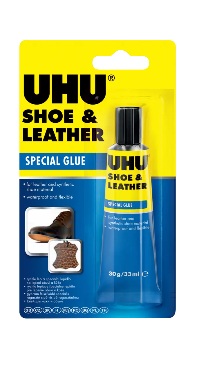 Method of application: a) The contact method: Apply shoe & leather evenly to both of the parts to be stuck together using a toothed spatula or a short-bristled brush. Apply a number of times to very absorbent materials (leather, fabric, felt, etc) until a readily visible film of adhesive remains. Keep the parts separate until the layer of adhesive is dry to the touch (this takes 10-15 minutes, depending on the temperature). Then place the parts together in their exact position and press together very firmly for a short time. No adjustment can be made. The firmness of the assembly depends on the amount of pressure applied and not the amount of time the pressure is applied – a few seconds is sufficient. If the assembly has been put together properly, it may be worked on immediately. b) The heat reactivation method: This method is recommended when both of the parts to be stuck together require a very high degree of initial bonding. Using this method also makes the assembly more resistant to heat. Apply adhesive to both parts of the assembly, as for the contact method (see above). Leave until completely dry. At any time subsequently, the parts are placed together in their exact position and bonded by applying heat in the region of +120°C to +150°C (using a heat press, infra-red lamp or a hot air blower; for small parts a household iron may be used). When using this method, care must be taken that the requested temperature must advance up to the adhesive joints. When this method is used, no adjustment is possible. If the parts of the join are under tension (curves, overlays, etc.), the assembly should be maintained in place until it has cooled down to room temperature. c) The solvent reactivation method: This method is recommended if it is preferred to extend the working time beyond about 30 minutes, for example to prepare the parts, or to temporarily store them and take up the assembly again at a later period in time. The adhesive is applied to both sides of the assembly, as for the contact method (see above). Leave until completely dry. Assembly can then be carried out at any time subsequently; one of the surfaces is wiped over with a lint-free cloth dipped in solvent and the parts are immediately pressed together very firmly. Suitable solvents for reactivation include methyl ethyl ketone (MEK), butyl acetate or nitro thinners. Lower temperatures and high humidity increase the hardening time of the adhesive and, thus, make good adhesion more diffic