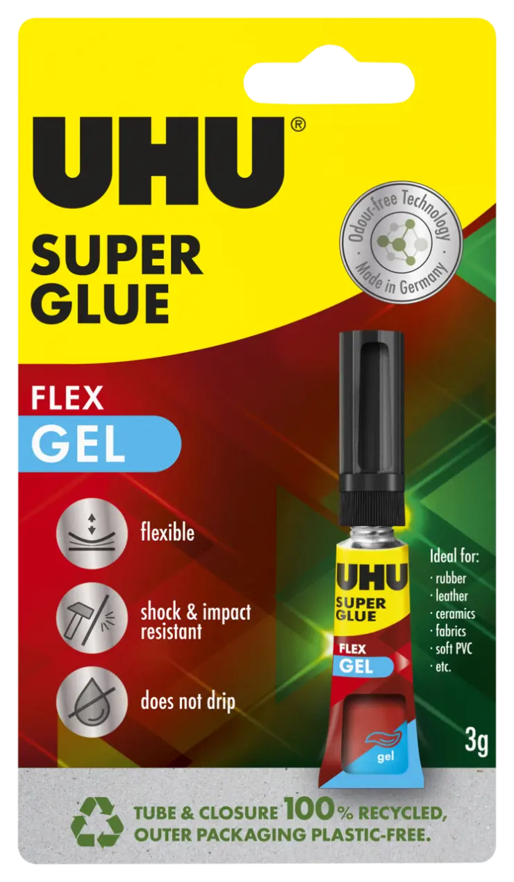 Ideal for small-area bonds. Glues almost all solid and flexible materials such as leather, rubber, many plastics (like PVC, ABS, PS, Plexiglas®, polycarbonate (Makrolon®), and phenolic resins (Bakelite®)), porcelain, ceramics, wood, metal, cork, felt, cloth (check suitability first), and Styrofoam®. Only partly suitable for glass (over a certain period of time the bond becomes brittle, causing it to weaken).