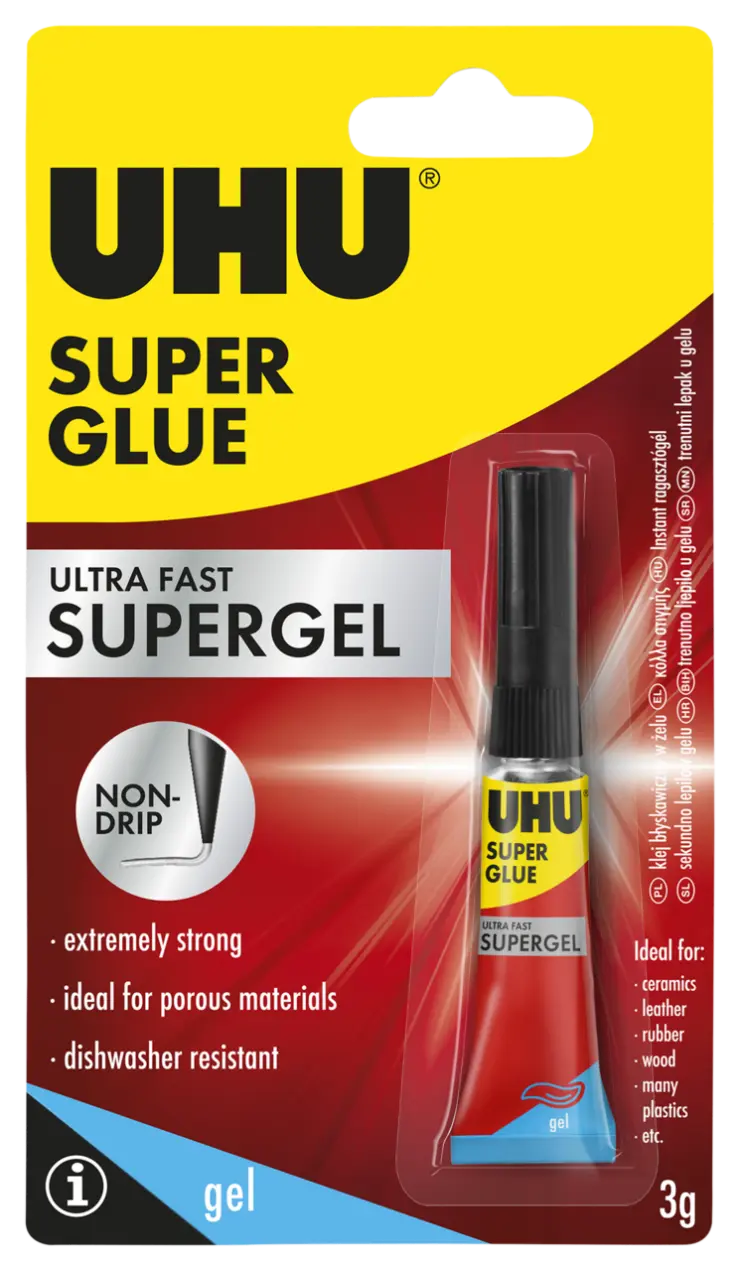 Ideal for small-area bonds. Glues almost all solid and flexible materials like ceramics, leather, rubber, many plastics (such as rigid PVC, ABS, PS, Plexiglas®, polycarbonate (Makrolon®), and phenolic resins (Bakelite®)), porcelain, metal, wood, cork, felt, and cloth (check suitability first). Only partly suitable for glass (over a certain period of time the bond becomes brittle, causing it to weaken). Ideal for porous materials.