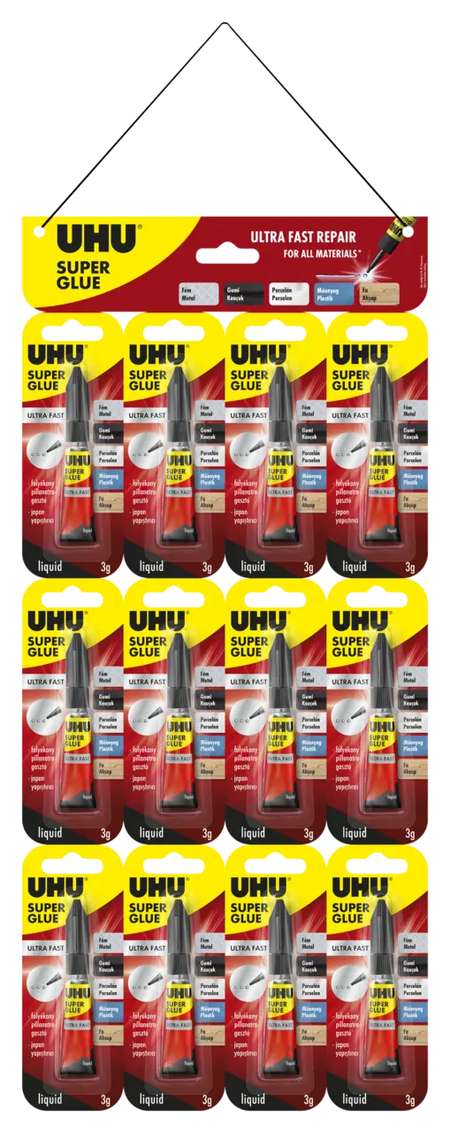 Ideal for small-area bonds. Glues almost all solid and flexible materials like many plastics (such as rigid PVC, ABS, PS, Plexiglas®, polycarbonate (Makrolon®), and phenolic resins (Bakelite®)), porcelain, ceramics, leather, metal, wood, cork, felt, cloth (check suitability first), and rubber. Only partly suitable for glass (over a certain period of time the bond becomes brittle, causing it to weaken).