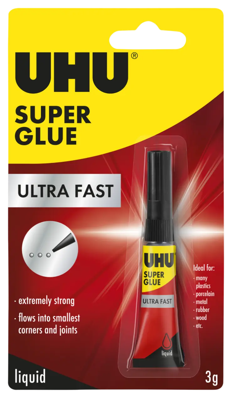 Ideal for small-area bonds. Glues almost all solid and flexible materials like many plastics (such as rigid PVC, ABS, PS, Plexiglas®, polycarbonate (Makrolon®), and phenolic resins (Bakelite®)), porcelain, ceramics, leather, metal, wood, cork, felt, cloth (check suitability first), and rubber. Only partly suitable for glass (over a certain period of time the bond becomes brittle, causing it to weaken).