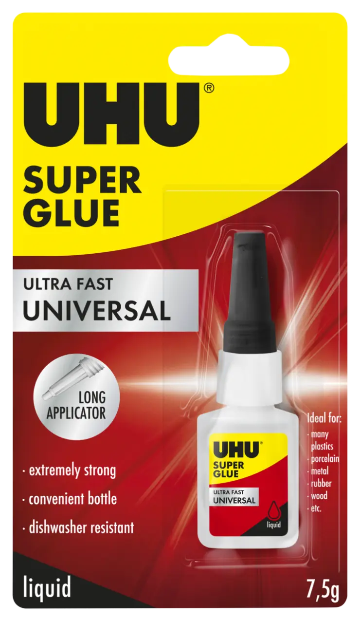Ideal for small-area bonds. Glues almost all solid and flexible materials like many plastics (such as rigid PVC, ABS, PS, Plexiglas®, polycarbonate (Makrolon®), and phenolic resins (Bakelite®)), porcelain, ceramics, leather, metal, wood, cork, felt, cloth (check suitability first), and rubber. Only partly suitable for glass (over a certain period of time the bond becomes brittle, causing it to weaken).