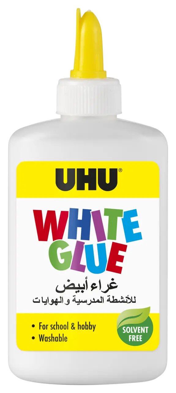 UHU White Glue – the solvent-free crafts glue for creative fun. Suitable for all common craft materials and transparent when dry. In a convenient bottle for easy and clean gluing. With a build-in spatula for even application of the adhesive. The glue washes out at 30°C.