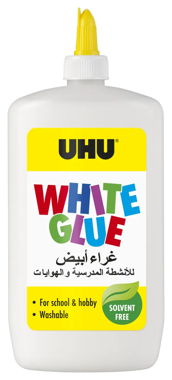 UHU White Glue – the solvent-free crafts glue for creative fun. Suitable for all common craft materials and transparent when dry. In a convenient bottle for easy and clean gluing. With a build-in spatula for even application of the adhesive. The glue washes out at 30°C.