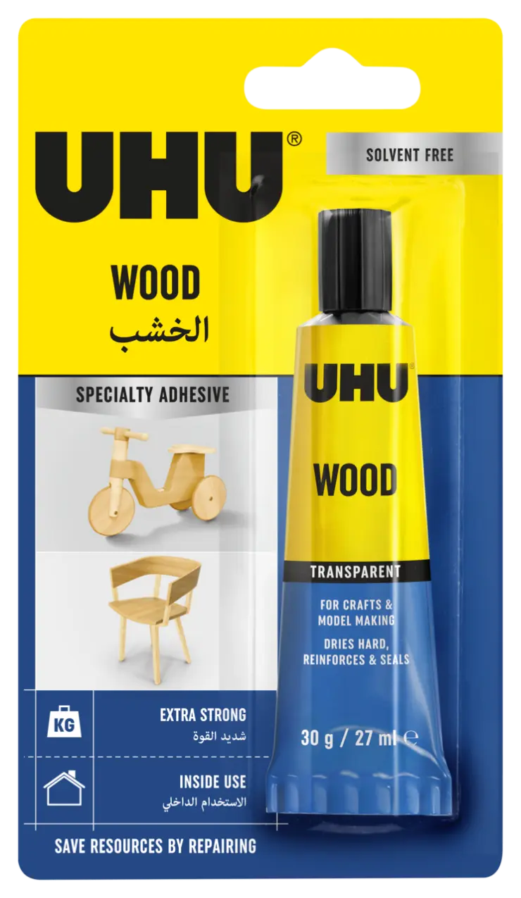 For moisture resistant joining and laminating of practically all hard, soft and exotic types of wood. Suitable for well-fitting, non-load bearing wooden structures using, for example, finger joints, dovetail joints, mortise and tenon joints, dowels and springs. Suitable for indoor applications such as doors and furniture in, for example, living rooms and offices. For surface bonding wood, hard and softboard, chipboard, multiplex plywood, MDF, paper, cardboard and hardboard. Also suitable for laminating veneer and hard plastic sheet (HPL, Formica, Duropal, Resopal) on a wooden surface. EN 204 D2: Interior spaces in which increased relative humidity occurs occasionally and for a short time, whereby the level of wood humidity remains below 18%.