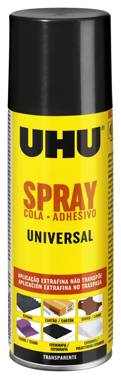 Agitar el bote antes de usar. Asegurarse de que la distancia entre la boquilla de pulverización y el material a recubrir sea de 20–25 cm. Pulverizar el adhesivo de forma fina y constante. Pegados: 1. Permanente: Aplicar una capa fina y uniforme sobre ambas superficies. Esperar al menos 10 minutos y, a continuación, presionar firmemente las piezas entre sí. El pegado es inmediato; ya no es posible corregir. Cuanto mayor sea la presión, mejor será el resultado del pegado. La duración de la presión no es determinante para la resistencia del pegado. 2. Corregible: Aplicar una capa fina y uniforme solo sobre una de las superficies y unir ambas piezas inmediatamente. Posteriormente, la posición de las piezas puede ajustarse durante un máximo de 5 minutos. Después, el pegado es permanente. Tiempo de secado —dependiendo de la temperatura y del material— hasta 24 horas. Una de las dos superficies debe ser absorbente o porosa. 3. Removible: Aplicar una capa fina y uniforme sobre la superficie que se desea que permanezca removible y esperar al menos 20 minutos. Posteriormente, la superficie es autoadhesiva y puede fijarse y retirarse varias veces.