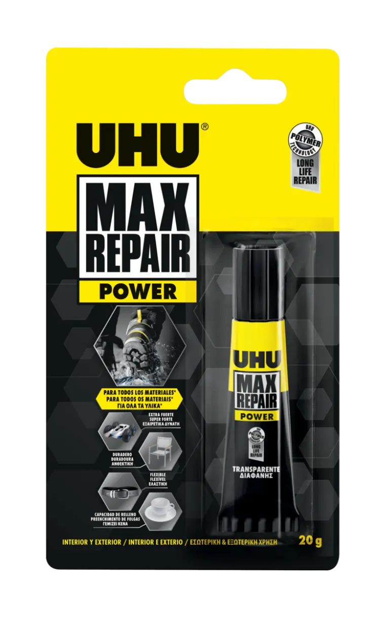 El Max Repair Power es un pegamento extremadamente fuerte para reparar materiales porosos y no porosos como madera, tela, cuero, corcho, metal, vidrio, plástico, goma, cerámica, piedra, cemento, etc. Adecuado para interiores y exteriores. El Max Repair Power está basado en la tecnología de polímeros de UHU. Los productos basados en esta tecnología garantizan una solución universal, fuerte, flexible, duradera, segura y sencilla para el uso diario.