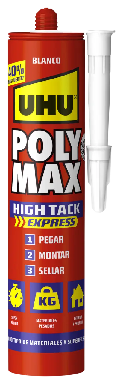 - Adherencia inicial muy elevada Alcance superrápido de la firmeza final Elevada firmeza final Elasticidad permanente Apto para interior y exterior Se puede pintar (probar previamente) Gran capacidad de relleno Resistente a temperaturas entre -40 °C y +100 °C Resistente al agua, los rayos ultravioleta y a las inclemencias Adhesivo 100 % (no encoge) También se adhiere a superficies ligeramente húmedas Sin disolventes Antimoho Excelente adherencia sin imprimación Sin ácidos, inodoro