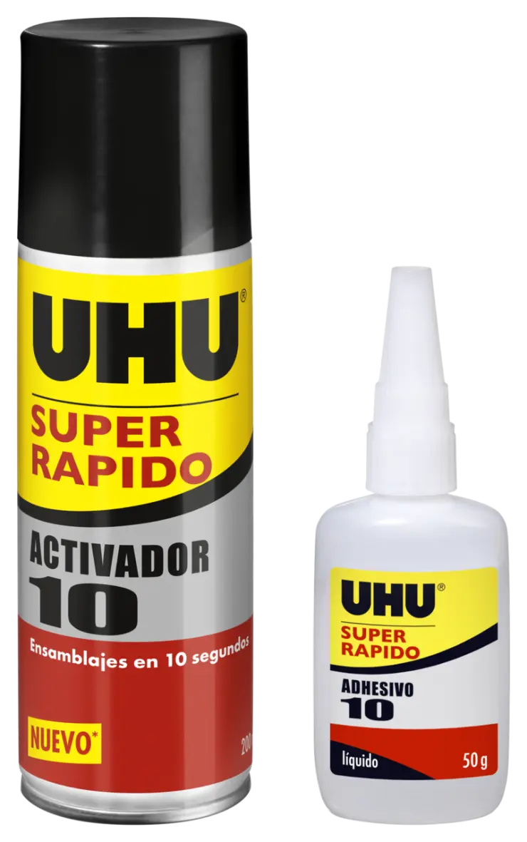 Rocíe una de las piezas con activador (a una distancia mínima de 20 cm; en caso de madera, rocíe ambas piezas). Lo ideal es dejar que se evapore por completo, pero tras 15-25 segundos ya es posible realizar una unión suficiente. Aplique una capa fina de adhesivo a la otra pieza y, a continuación, ensamble ambas piezas. Presione firmemente durante 10 segundos. Después de su uso, limpie la boquilla del bote de adhesivo con un paño seco y ciérrelo colocando la tapa.