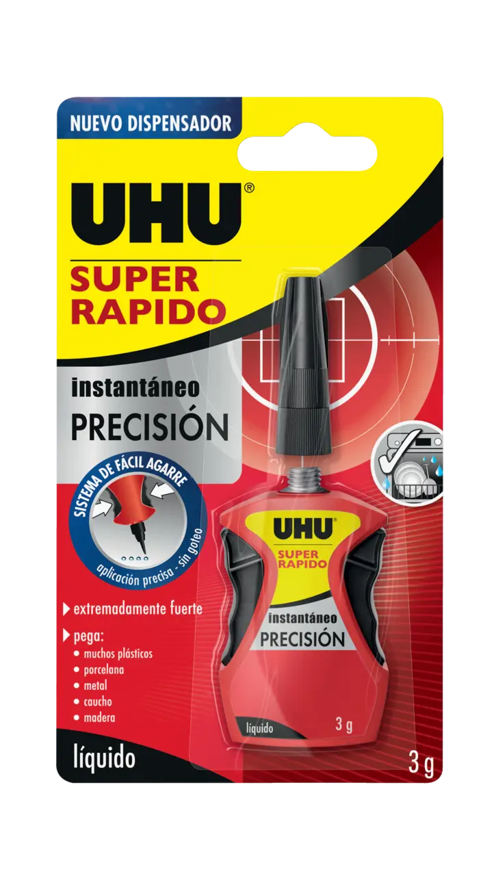 Ideal para pegar pequeñas superficies. Pega casi todos los materiales sólidos y flexibles, como muchos plásticos (como PVC rígido, ABS, PS, Plexiglas®, policarbonato (Makrolon®) y resinas fenólicas (baquelita®)), porcelana, cerámica, cuero, metal, madera, corcho, fieltro, tela (comprobar primero la idoneidad) y caucho. Sólo es parcialmente adecuado para el vidrio (con el paso del tiempo, la unión se vuelve frágil y se debilita).