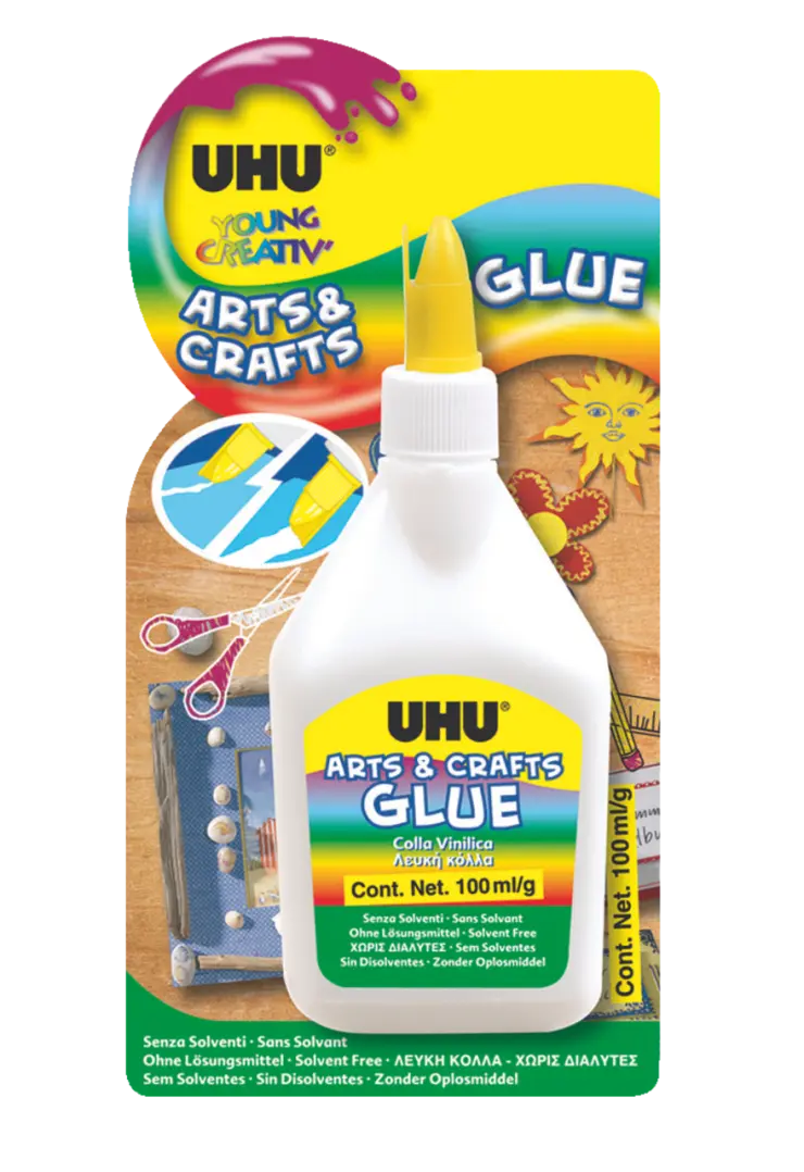 WHITE-/CRAFTS GLUE, Arts & Crafts Glue Adhesivo Arts & Crafts (cola vinílica): el pegamento sin disolventes para manualidades para divertirse de forma creativa. Adecuado para los materiales de manualidades más comunes y transparente al secarse. Se presenta en un práctico frasco para pegar de forma sencilla y limpia. Con una espátula integrada para aplicar el adhesivo de manera uniforme. El pegamento puede lavarse a 30 °C.