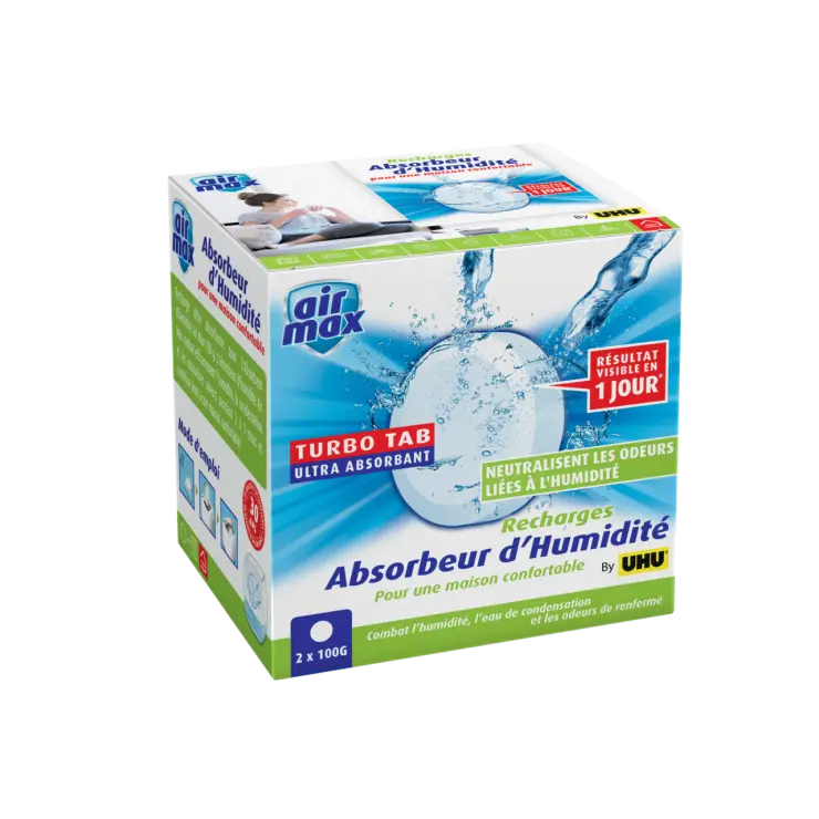 100 g agissent pendant approximativement 3 mois dans une pièce d’environ 10 m³ et absorbent environ 100 millilitres d’eau, en fonction de la température, de l’humidité et de la dimension de la pièce.