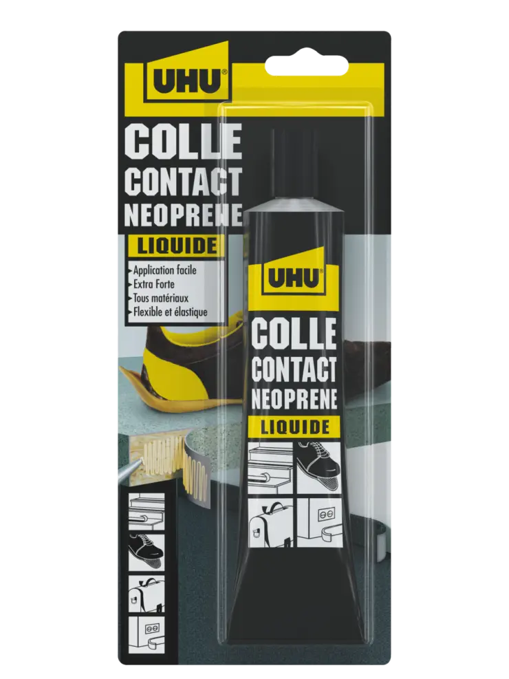 Colle les plaques de revêtement en plastique (comme le Formica®), les placages, les panneaux de fibres de bois, les bords en plastique, le caoutchouc, le cuir, le linoléum, le liège, le textile ou la mousse de polyéther entre eux et sur le bois, l'aggloméré, le béton et le métal. Convient en particulier au collage de nez de marches, de revêtements d'escalier, de bouchons ou de feutres sous les meubles. Aussi pour les réparations par exemple de chaussures, de sacs à main, de jouets, de tapis ou pour faire des bricolages.