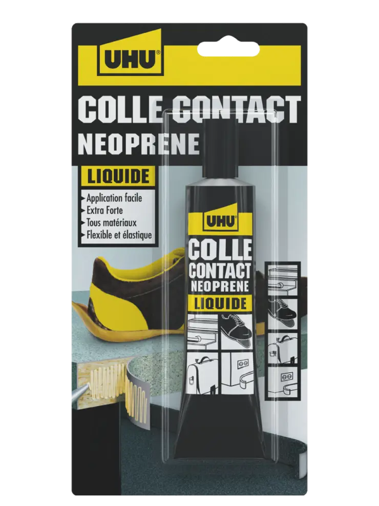 Colle les plaques de revêtement en plastique (comme le Formica®), les placages, les panneaux de fibres de bois, les bords en plastique, le caoutchouc, le cuir, le linoléum, le liège, le textile ou la mousse de polyéther entre eux et sur le bois, l'aggloméré, le béton et le métal. Convient en particulier au collage de nez de marches, de revêtements d'escalier, de bouchons ou de feutres sous les meubles. Aussi pour les réparations par exemple de chaussures, de sacs à main, de jouets, de tapis ou pour faire des bricolages.