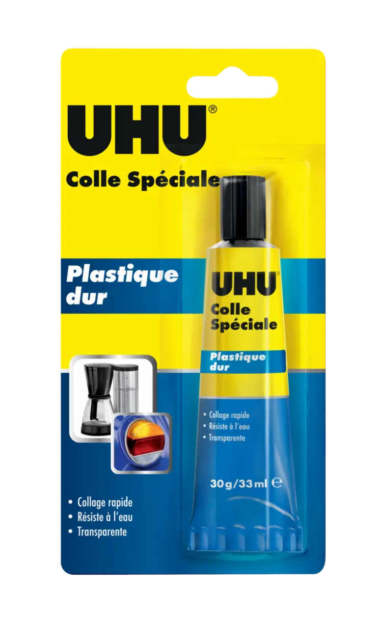 En fonction de l'exigence spécifique, l'une ou les deux parties à connecter sont enduites de colle et assemblées immédiatement. Une première force d'adhérence est atteinte après 5 à 10 minutes. La force d'adhérence élevée de la colle spéciale pour plastiques durs UHU est obtenue en dissolvant légèrement la surface de la matière plastique. Pour cette raison, la colle ne doit être appliquée qu'en petites quantités sur les plastiques à paroi mince.
