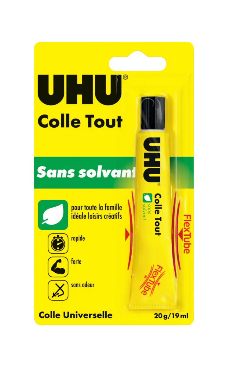Universelle - colle le carton, le papier, le feutre, le cuir, le liège, le tissu, le bois, entre eux et au métal, à la porcelaine, au verre, au Styrofoam® et à un grand nombre de matières plastiques.
