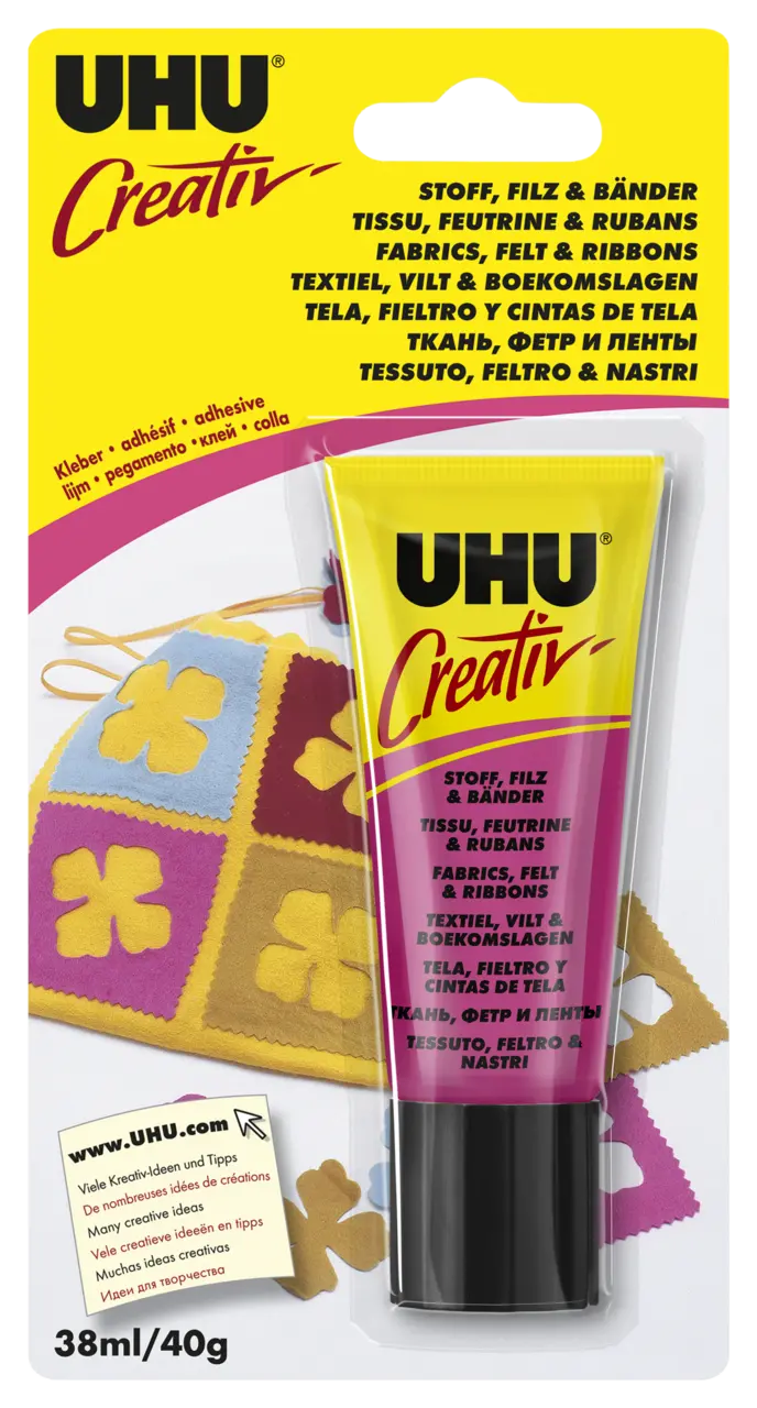 Colle le tissu, la feutrine et les rubans entre eux ou sur d'autres matériaux. Convient aussi pour la laine, le coton hydrophile, les pompons, les cure-pipes, les cordelettes, etc.