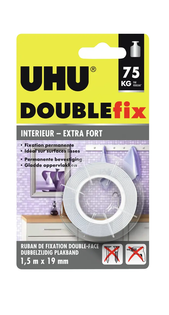Collez le produit sur l'objet à installer en évitant de créer des poches d'air. Retirez le film de protection sans toucher l'adhésif. Fixez l'objet à l'endroit souhaité et pressez fermement. La résistance finale de l'objet est atteinte après seulement 60 minutes.