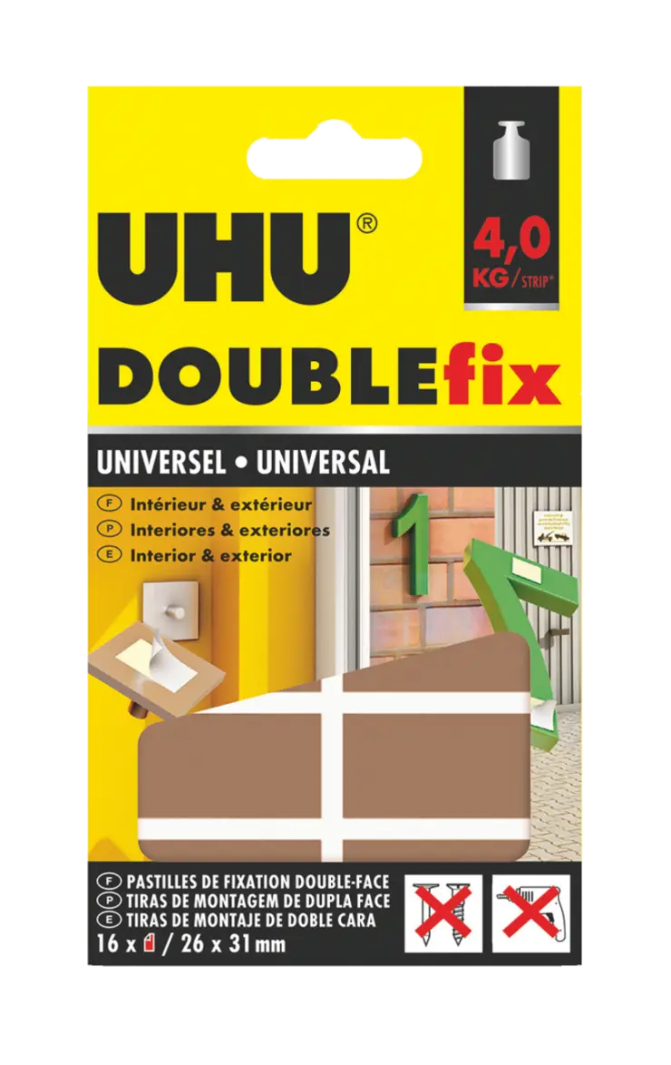 - Ruban adhésif double face Pouvoir adhésif extrêmement élevé Utilisation universelle Toutes surfaces Intérieur et extérieur Résiste à l'humidité Résiste à la température Propre, facile et rapide