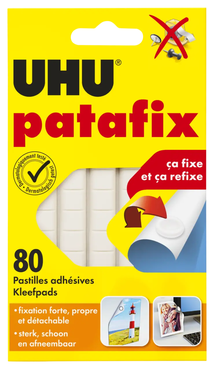 1) Détacher les pastilles. 2) Malaxer jusqu’à ce que la pâte soit souple. 3) Appliquer la patafix UHU au dos de l'objet à fixer. 4) Presser fermement contre le support. Pour réutiliser, recommencer à l'étape 2).