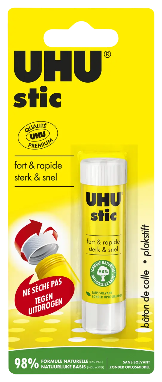 Le célèbre bâton de colle « Fabriqué en Allemagne » pourvu d'un bouchon à visser exclusif qui garantit que la colle ne dessèche pas. La formule est composée à 98 % d'ingrédients naturels (y compris l'eau) et est exempte de solvant. Colle solidement, rapidement et durablement, elle s'étale uniformément, est hautement efficace et se lave à froid. Un allié du quotidien!