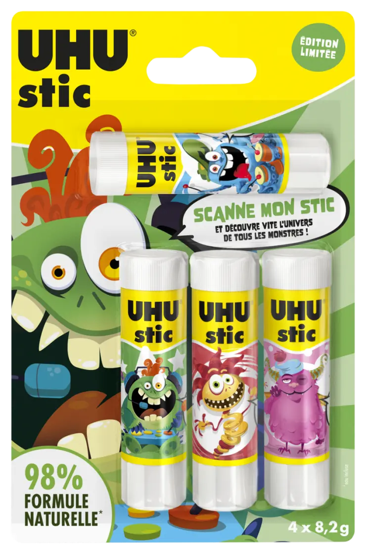 Le célèbre bâton de colle « Fabriqué en Allemagne » pourvu d'un bouchon à visser exclusif qui garantit que la colle ne dessèche pas est accompagné de nos 6 petits monstres sont prêts à vous présenter leurs personnalités complètement loufoques.