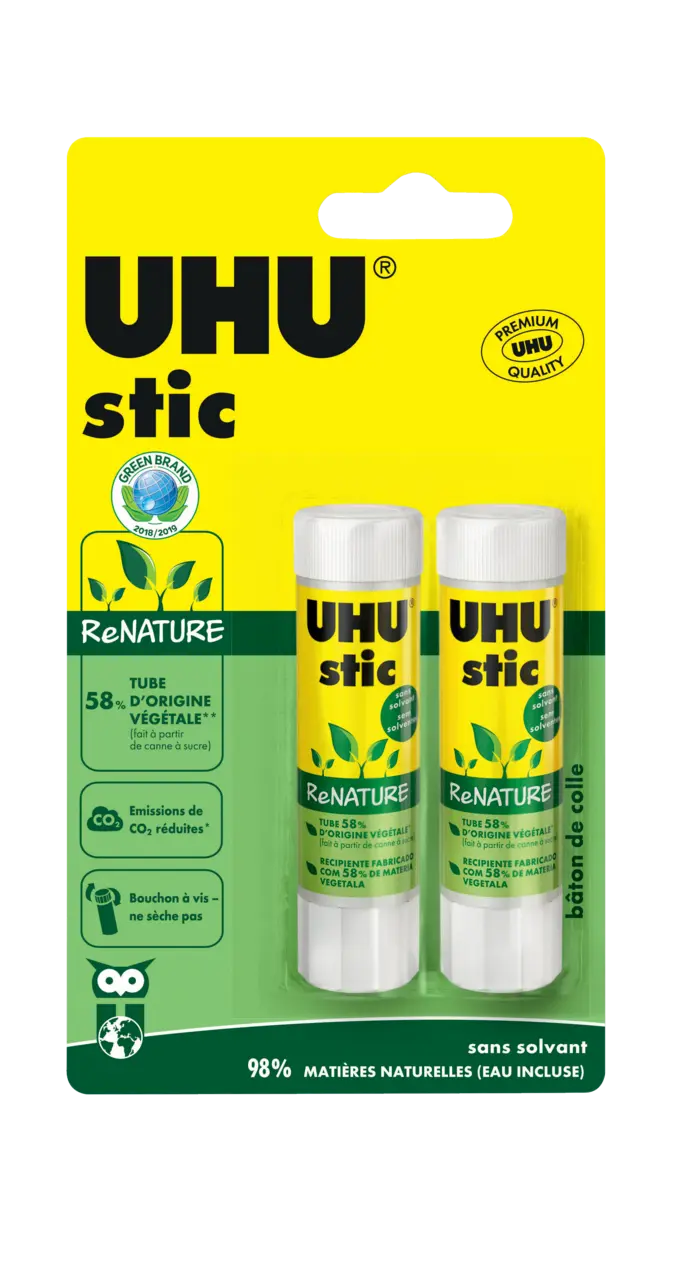 Le bâton de colle UHU, fabriqué en Allemagne, dans un contenant composé à 58% de matières premières d’origine végétale. Sa fabrication permet de réduire les émissions de CO2* et la consommation d’énergies fossiles*. Sans solvant, il se compose à 98% d’ingrédients d’origine naturelle (y compris l’eau). Son bouchon à vis garantit que la colle ne se dessèche pas.