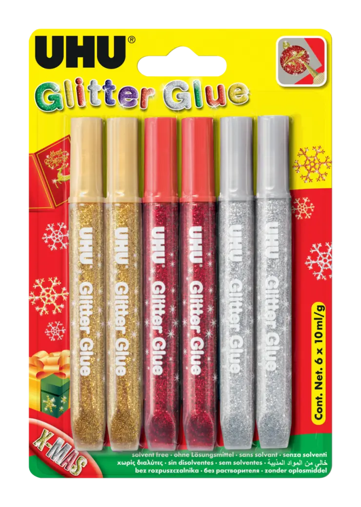 GLITTER-/DECORATION GLUE, UHU Glitter Glue ljepilo Glitter – ljepilo sa šljokicama za izradu rukotvorina i kreativno ukrašavanje raznih materijala. Za izradu slika, čestitki, papira za umatanje, okvira za slike i još mnogo toga zahvaljujući iznimno svjetlucavim efektima šljokica. Izuzetno mekana tuba s preciznim vrškom omogućuje čisto i precizno nanošenje i idealna je za sitne ruke. Ne kaplje i ne rasteže se. Ne sadrži otapala i ispire se vodom. Dermatološki testirano - međutim nije kozmetički proizvod. U slučaju dodira s kožom, isprati vodom.