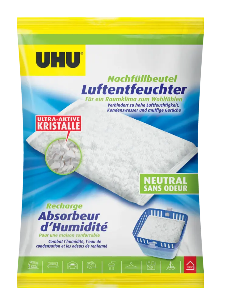Suzbija kondenzaciju, ustajale mirise i miris vlage. Sakupljač vlage je bez mirisa, nečujan, ne koristi energiju i jednostavno se puni. Sakupljač vlage smanjuje previsoku razinu relativne vlažnosti zraka u svim zatvorenim prostorima s malo ili bez ventilacije. Idealan je za podrum, garažu, tavan, ormar, kamp kućicu, brod, šupu itd.